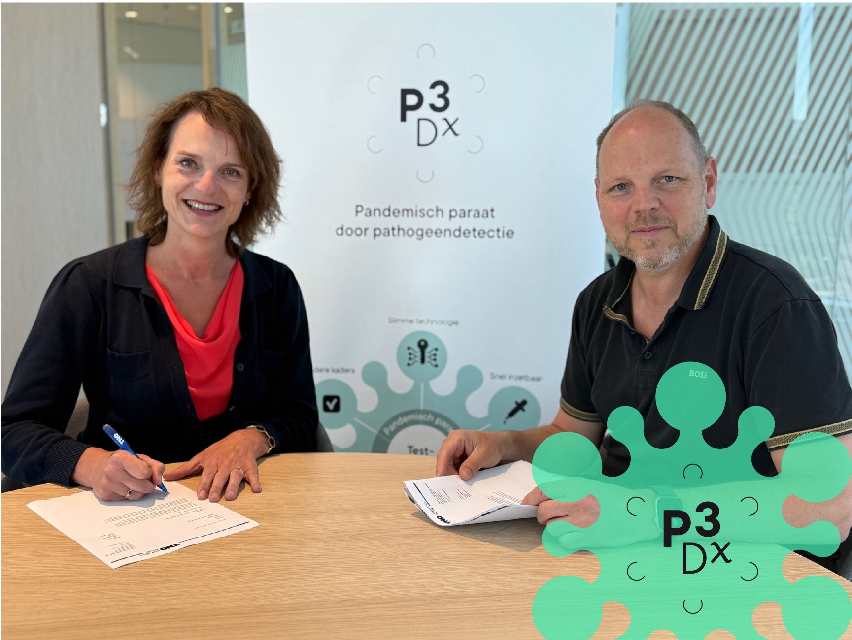 Het gunningsbesluit is ondertekend door de directie TNO gezond, Marjoleine van der Zwan, in het bijzijn van P3Dx-trekker Bart Keijser.